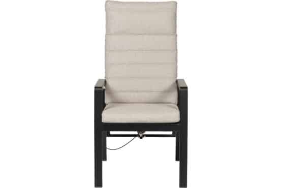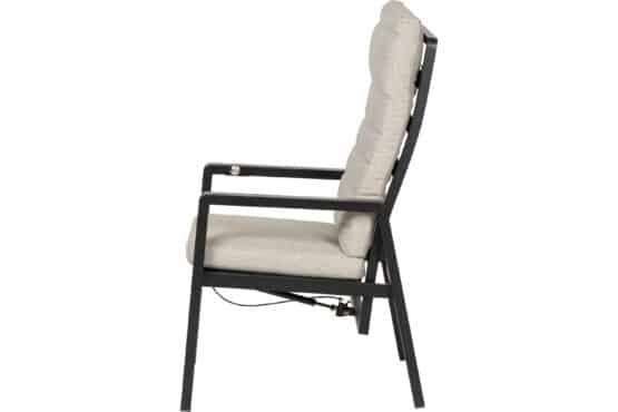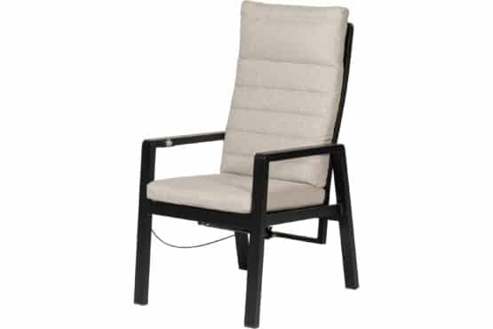 Almeria regulerbar spisestol er en svært komfortabel lenestol med ramme i antrasittfarget aluminium. I stolens sete er det textilene for ekstra komfort og de behagelige putene er av naturfarget spun-polyester. Stolryggen har aluminiumslameller og kan justeres trinnløst til ønsket posisjon med en diskret trykknapp på høyre armlene.