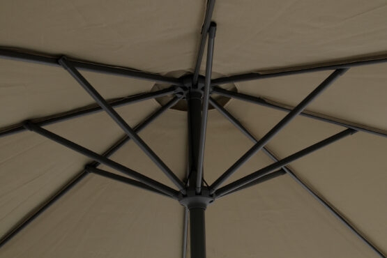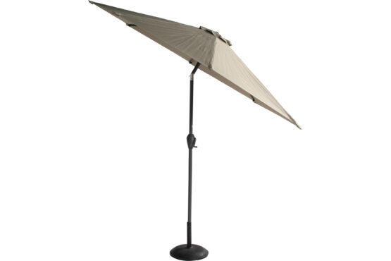 Parasollen åpnes enkelt med sveiv, og er utstyrt med enkel tilt-funksjon som lar deg vippe parasollen til siden ved hjelp av en trykknapp. Dette gir deg muligheten til å justere skyggen etter solens posisjon – enten i rett vinkel eller med full tilt til én side.