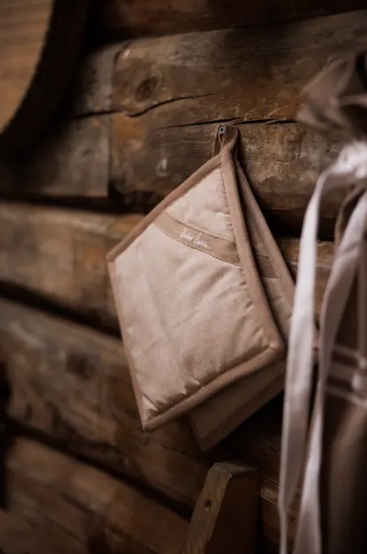 Grytekluter i melert bomull med bred kant. Gryteklutene har åpning til hånden og brodert Halvor Bakke-logo, samt hempe til oppheng. Flott som vertinnegave eller til mannen som har alt.