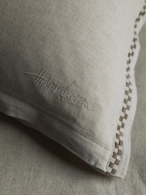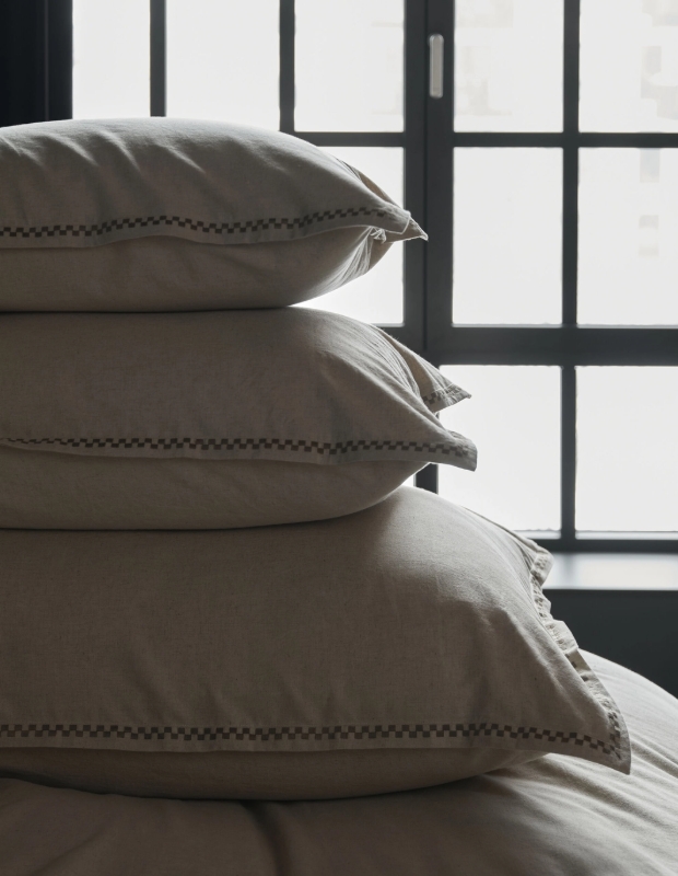 Lin har noe naturlig vakkert over seg som fremhever kvaliteten på andre tekstiler på en raffinert måte, og gir den taktiliteten som hever helhetsuttrykket på hele sengen. Trae putevar er en blanding av bomull og lin som demper litt av krøllingen samtidig som den er litt mykere mot huden, men den har linens egenskaper og er elegant og luksuriøs.