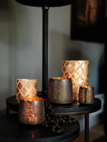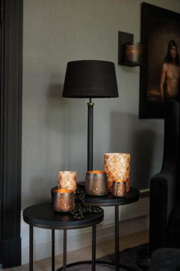 Lysholderen med capiz skjell i bronsefarget tone skaper en lun og stemningsfull atmosfære.