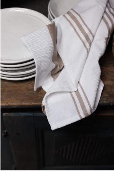 Kjøkkenhåndkle i bomull med klassisk stripedesign på hvit bunn og Halvor Bakke-logo i nederkant. Håndkleet har en dekorativ vaffeltekstur som også gir det en god oppsugingsevne, samt hempe til oppheng i hjørnet.