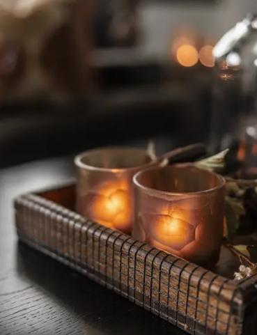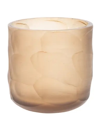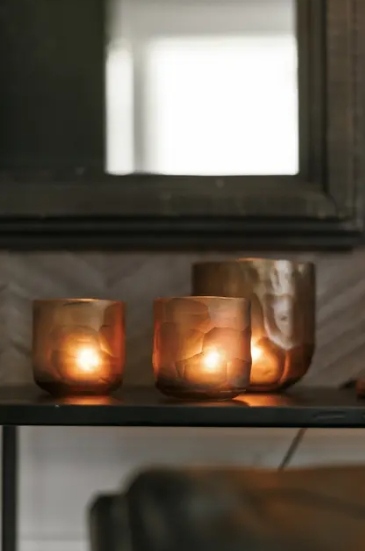 Telysholder i banket glass i en flott brunfarge med matt overflate. Lykten har banket, avrundet fasong. Kommer i to størrelser, og er like fin alene som samlet i gruppe med flere.