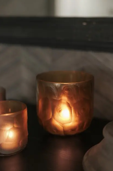 Telysholder i banket glass i en flott brunfarge med matt overflate. Lykten har banket, avrundet fasong. Kommer i to størrelser, og er like fin alene som samlet i gruppe med flere.